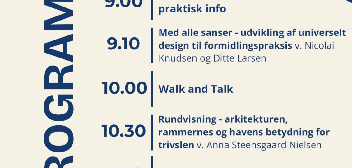 Mødet byder på et oplæg om universelt design og formidlingspraksis ved Nicolai Knudsen og Ditte Larsen, en Walk and Talk samt en rundvisning på museet, hvor Anna Steensgaard Nielsen fortæller om arkitekturens, rammernes og havens betydning for trivsel. Der er desuden tid til netværk og frokost.